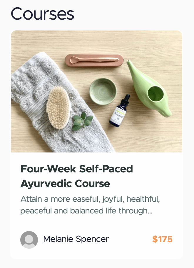Learn Ayurvedic basics or deepen your existing practice. This four-week course includes course materials and journal prompts, as well as downloadable audio meditations, breathwork, myofascial release and gentle yoga videos, links to Ayurvedic recipe resources and a section designed to help you move forward using the tools and knowledge you’ve gained throughout the course. (Learn more below.)